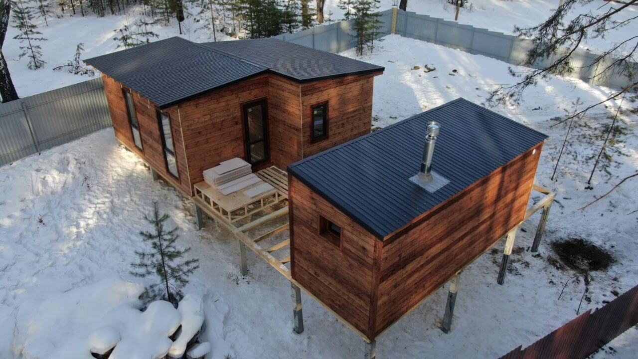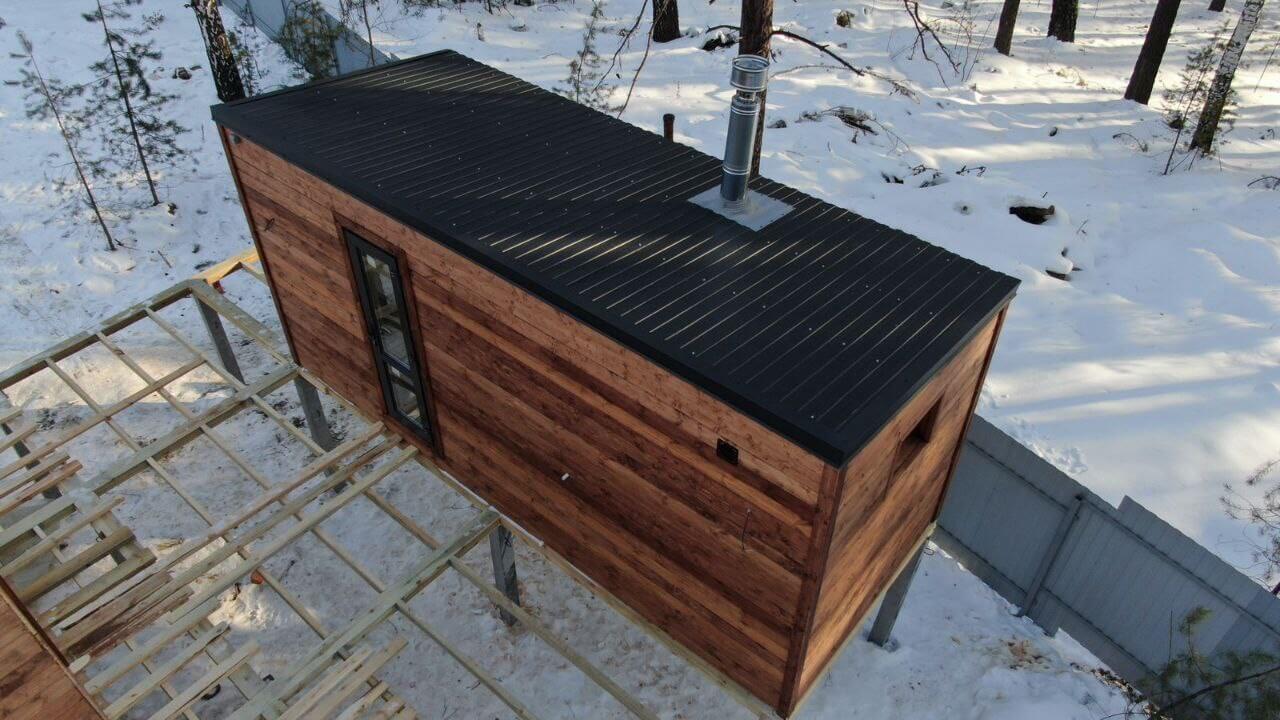 Профнастил в оттенке "Серый Графит" прекрасно сочетается с деревянными строениями.