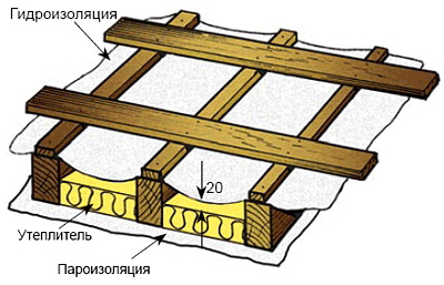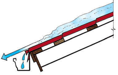 Такая конструкция обеспечивает стекание конденсата прямо в желоб. В зависимости от конфигурации свеса крыши предусмотрен вариант вывода гидроизоляции без покрытия последней доски обрешётки.