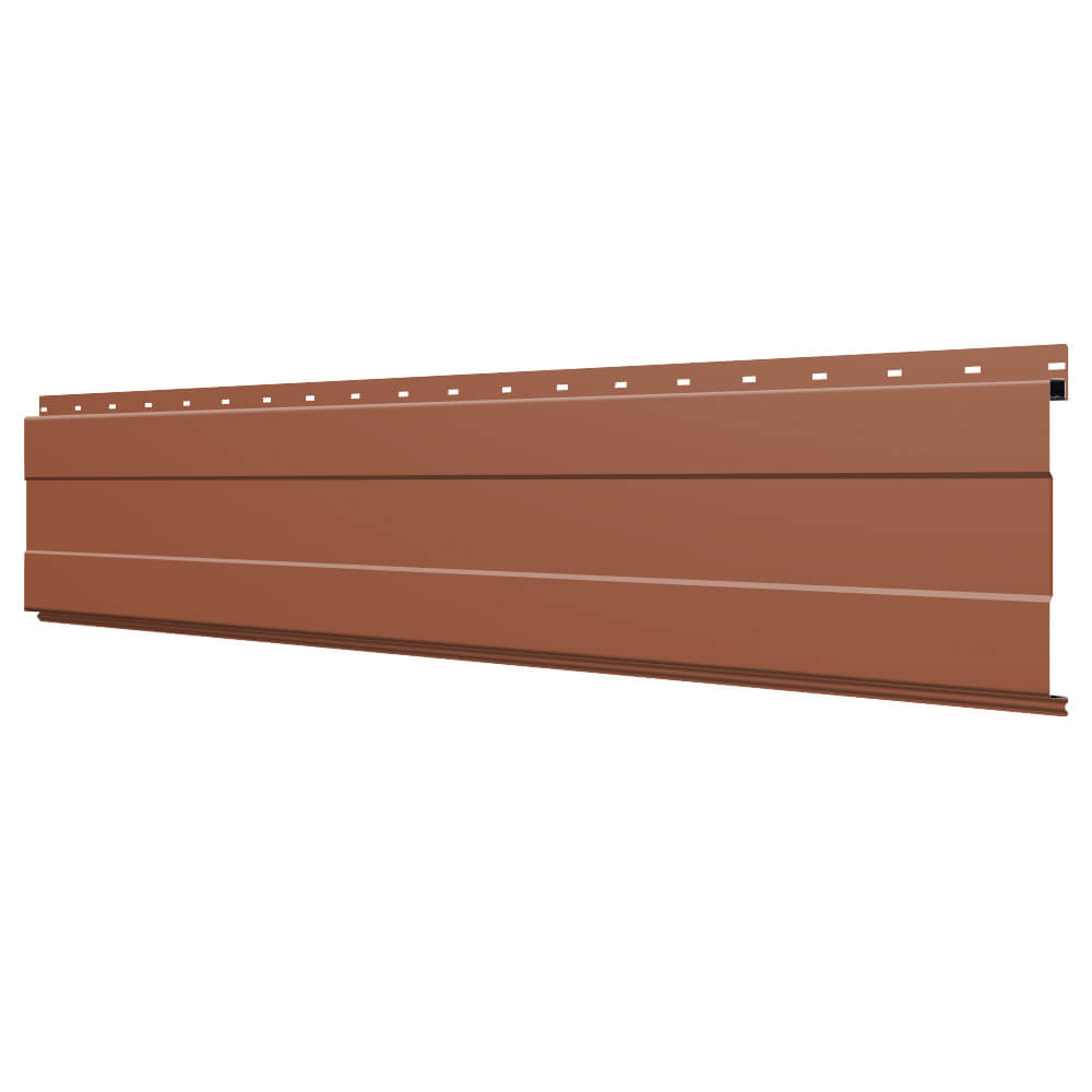 Линеарная потолочно-стеновая панель с ПОЛОСОЙ усиленная цвет RAL8004 Терракотовый применяется в качестве софитов для подшивы крыши, наружной и внутренней отделки потолков, стен, фронтонов фасада дома в Атырау.