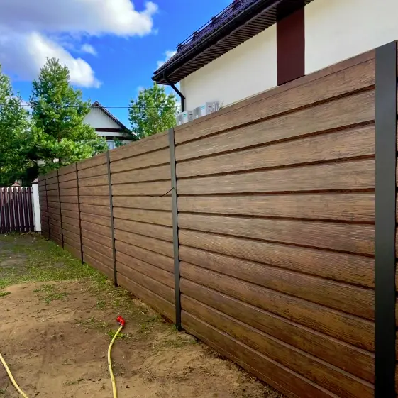 Элегантный забор, который с первого взгляда подчёркивает вкус и статус хозяина. Горизонтальный секционный забор из металлического сайдинга Евро-Брус — это гармония прочности металла и благородного вида натурального дерева. Стильный оттенок Тёмный Каштан с объёмным 3D покрытием Принтек создаёт впечатление дорогого массива, но при этом надёжно защищает ваш участок и не требует сложного ухода. Такой забор — не просто ограждение, а элемент имиджа вашего дома, который каждый день будет радовать глаз и вызывать восхищение у гостей и соседей.